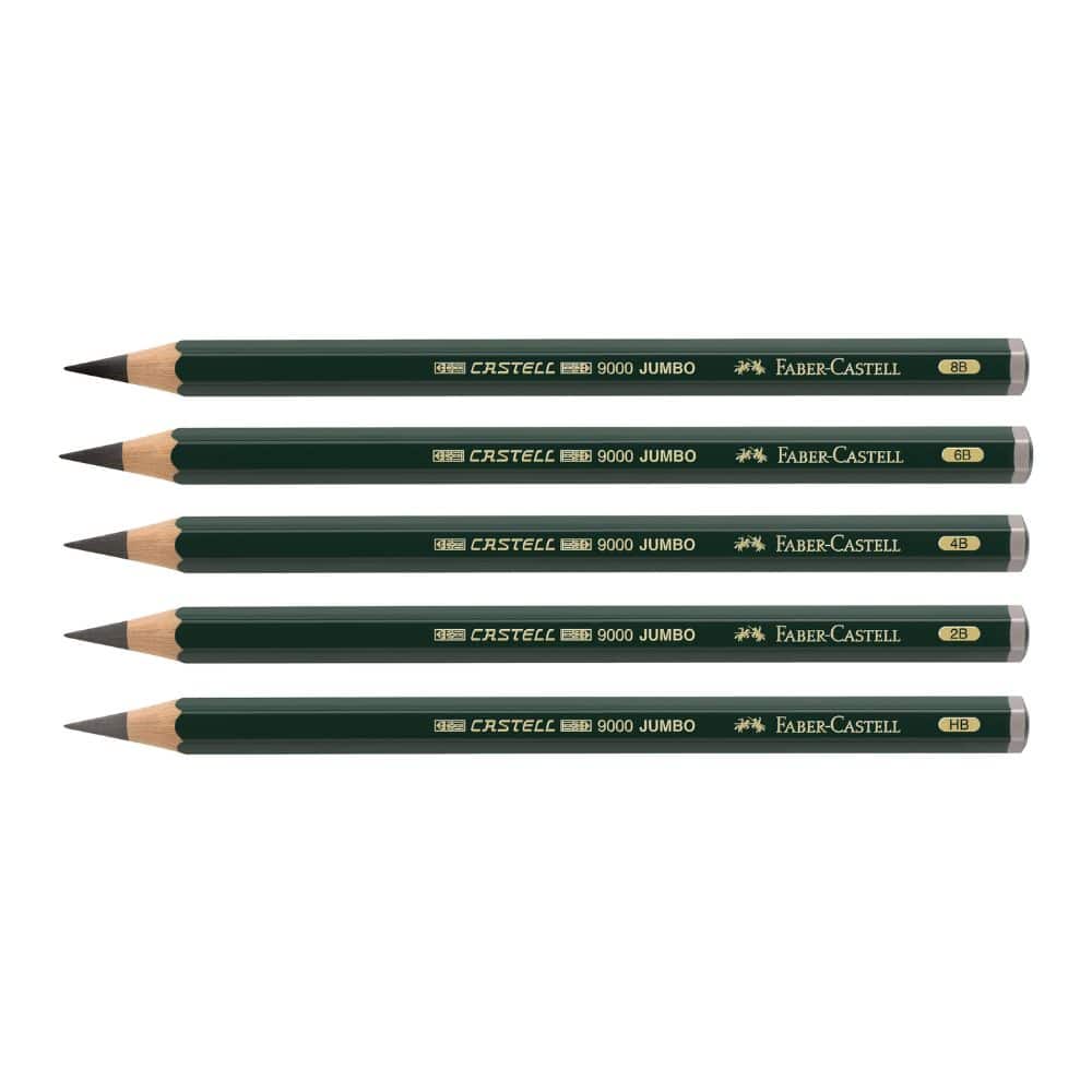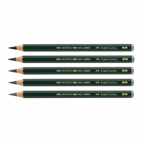 Les crayons graphite de haute qualité pour artistes Castell 9000 existent également en version Jumbo avec une mine extra large. Le Castell 9000 Jumbo FABER CASTELL est idéal pour les esquisses rapides ainsi que pour les travaux artistiques sur de grandes surfaces. Ce crayon graphite de qualité supérieure possède une mine ultra-épaisse de 5,3 mm de diamètre. Parfait pour les travaux artistiques, les études et les esquisses ambitieuses, il est doté d’un vernis écologique à base d’eau et est extrêmement résistant à la casse. Disponible en 5 degrés de dureté : HB, 2B, 4B, 6B, et 8B.
