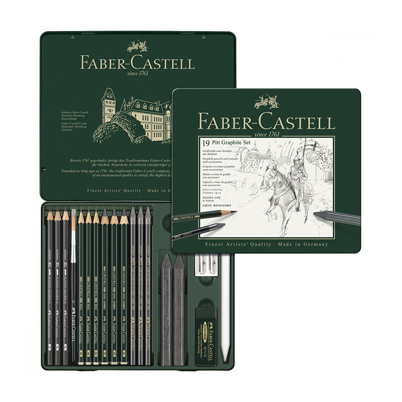 Ce set est composé de d’un Castell 9000, d’un Castell 9000 Jumbo et de crayons graphite aquarelle dans les niveaux de dureté 2B, 4B et 8B, des crayons Pitt Graphite Pure dans les degrés de dureté 3B, 6B et 9B, des craies Pitt Graphite dans les degrés de dureté 6B, 9B et des accessoires.