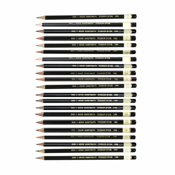 Depuis 1790, Koh-I-Noor fabrique des crayons en graphite, et le crayon d’artiste de la série 1900 perpétue cette tradition avec élégance. Son vernis noir satiné lui confère un style caractéristique et raffiné. Ce modèle se distingue par une large gamme de duretés, allant de 8B (très tendre) à 10H (très dur), pour répondre aux besoins de tous les artistes. Les crayons de duretés 10H à 2B possèdent une mine de 2 mm de diamètre, tandis que les crayons plus tendres, de 3B à 8B, offrent un diamètre de 2,5 mm pour une application plus douce et nuancée.