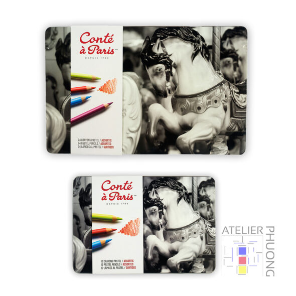 Disponible en boîte métallique par 12 et 24 crayons pastel assortis.