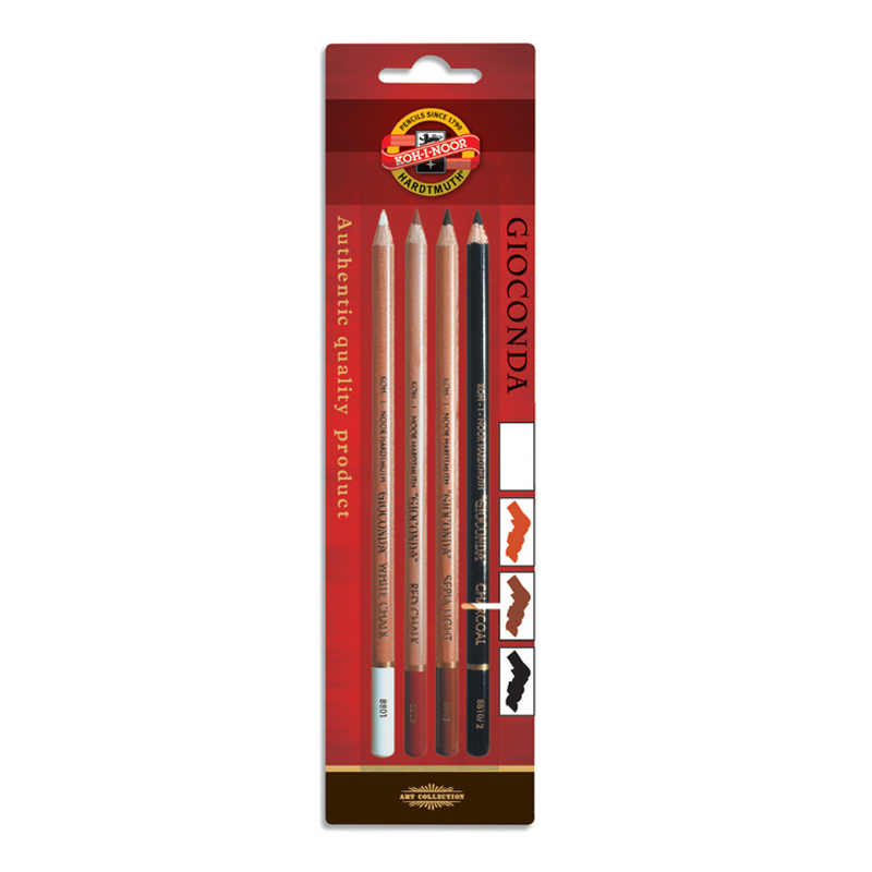 Le blister Gioconda de 4 crayons Beaux-Arts de Koh I Noor est composé de : 1 crayon blanc, 1 crayon sanguine grasse, 1 crayon sépia claire et 1 crayon fusain 2B.