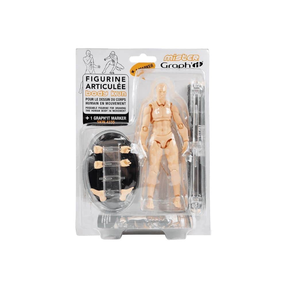 Le set complet comprend une figurine articulée, 2 paires de mains, 1 paire de pieds, un socle lesté pour stabiliser la figurine, un marqueur GRAPH’IT de couleur chair, ainsi qu’un mode d’emploi détaillé avec des exemples pas à pas. La figurine mesure environ 14 cm de hauteur.