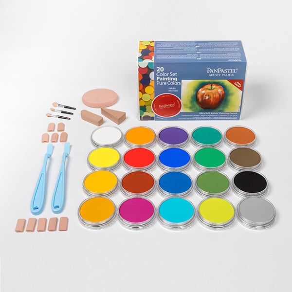 PanPastel™ propose un coffret de 20 Pastels tendres extra-fins “Couleurs pures”. Vous trouverez dans ce set les nuances suivantes : 100.5 – Blanc de Titane, 220.5 – Jaune de Hansa, 250.5 – Jaune Diarylide, 270.5 – Ocre jaune, 280.5 – Orange, 340.5 – Rouge permanent, 380.5 – Oxyde de fer rouge, 430.5 – Magenta, 470.5 – Violet, 520.5 – Bleu d’outremer, 560.5 – Bleu de phthalo, 580.5 – Turquoise, 620.5 – Vert de phthalo, 640.5 – Vert permanent, 660.5 – Vert oxyde de chrome, 680.5 – Vert jaune, 740.5 – Terre de sienne brûlée, 780.5 – Terre d’ombre naturelle, 800.5 – Noir et 820.5 – Gris neutre. Il contient également des accessoires tels que deux couteaux avec 10 embouts (N°1 & N°2), 3 mini applicateurs, 1 éponge d’art Sofft – Barre ovale, 1 éponge d’art Sofft trinagulaire, 1 éponge d’art Sofft – Maxi-ovale et 4 pots de rangement.