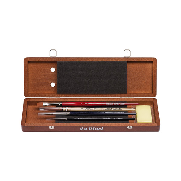 La Boîte en noyer vernis de pinceaux aquarelle DA VINCI est facile à manier avec des coins arrondis. Il contient :