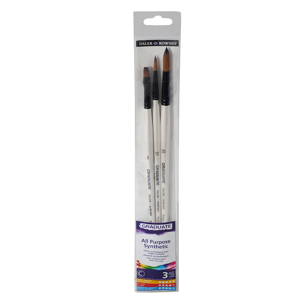 La Pochette de 3 pinceaux manche long Graduate DALER ROWNEY contient 1 brosse plate courte 8, 2 brosses pointes taille 12 et 20.