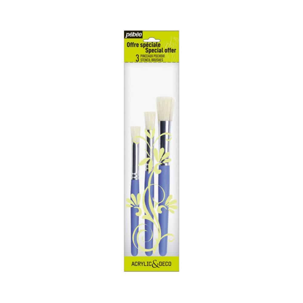 Ce Set de trois pinceaux à pochoir PEBEO est spécialement conçu pour les travaux de pochage et de décoration. Dotés de brosses courtes et trapues en soies naturelles blanches, ces pinceaux se distinguent par leur fermeté, leur robustesse et leur flexibilité. Idéals pour une application par tapotement vertical, ils offrent une excellente rétention de la couleur et permettent de réaliser des dégradés subtils avec précision.