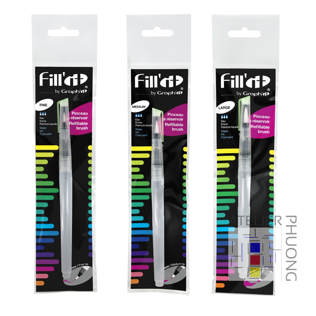 Le Pinceau réservoir rechargeable FILL’IT by GRAPH’IT est un outil pratique pour réaliser des aquarelles partout. Il peut être rempli avec des encres acryliques, de la peinture liquide ou de l’eau. Pour augmenter le débit et obtenir l’effet souhaité, il suffit de presser le corps du pinceau. Ce pinceau possède des poils en fibre synthétique résistants et un réservoir de 8 ml. Simple et rapide à recharger, il est doté d’une pointe interchangeable qui alimente un flux constant et régulier de liquide. Ils sont facile à nettoyer.