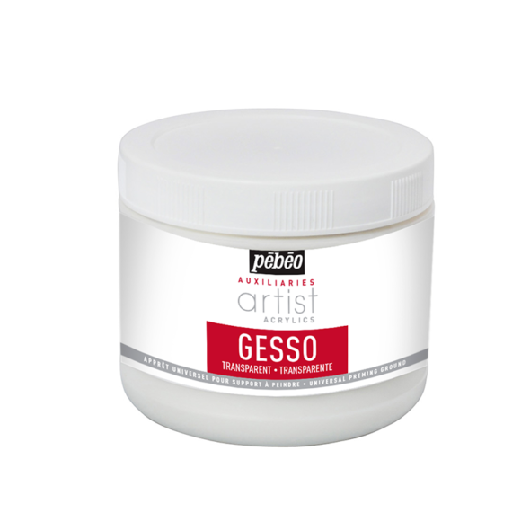 Le Gesso transparent de PEBEO est un enduit universel qui s’emploie pour préparer vos supports à peindre, toiles, papiers, cartons, planches de bois etc. Il s’applique sur une surface propre et non grasse. Cela permet d’obtenir une surface régulière mate mais aussi de renforcer l’accroche de la peinture. Ce gesso est particulièrement couvrant, et sèche rapidement, environ 30min. Contrairement à un liant acrylique, la surface apprêtée avec le Gesso transparent reste absorbante.