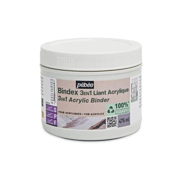 Le Bindex 3 en 1 est un liant acrylique plus fluide qu’un gel, aux multiples usages : seuls ou en mélange à la couleur, en toutes proportions et à tous les stades d’un travail. Non jaunissant 3 en 1 pour la préparation des couleurs acryliques (en mélange aux couleurs acryliques, il leur donne de la transparence et de la profondeur sans les appauvrir), glacis, collages, incrustations, transferts d’image, durcir les objets en papier, … Finition translucide et satinée-mate. Séchage rapide, dilution à l’eau.