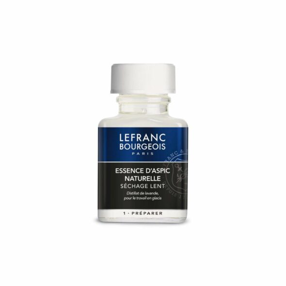 Diluez vos huiles et lavis tout en ralentissant les temps de séchage avec l’Essence d’Aspic Naturelle LEFRANC BOURGEOIS, distillée à partir d’épis de lavande. Idéale pour les glacis et les esquisses préliminaires, elle favorise l’oxydation, permettant des traits précis et transparents. Plus lente que la térébenthine et l’essence minérale, elle est puissante même en petites quantités et offre une excellente alternative aux solvants classiques.