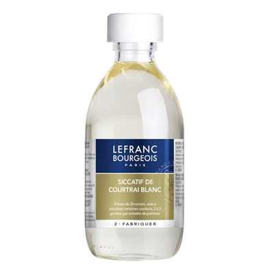 Le Siccatif de Courtrai blanc de LEFRANC BOURGEOIS aide à la siccativation de la couleur à l’huile, car il est le plus facile à employer. Son utilisation doit être précise : une goutte pour une part de couleur.