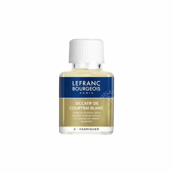 Accélérez le durcissement de votre pâte avec le Siccatif de Courtrai blanc LEFRANC BOURGEOIS. Cet additif augmente le taux d’absorption d’oxygène de votre huile, vous permettant ainsi de contrôler les vitesses de prise. De couleur pâle et sans plomb, il n’altère pas les couleurs claires et améliore l’uniformité de la peinture. Utilisez-le avec parcimonie, à raison de deux à trois gouttes par touche de couleur, pour éviter une siccativité trop rapide et les fissures dans la peinture. Comme la térébenthine et l’essence minérale associées à de l’huile, cet additif peut être utilisé pour fabriquer votre propre médium.