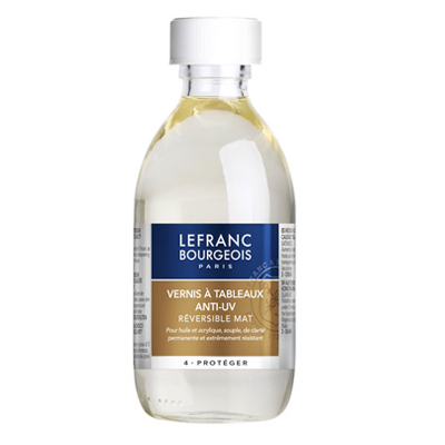 Le Vernis à tableau mat transparent LEFRANC BOURGEOIS protège votre œuvre de la poussière et des rayons UV tout en offrant une finition mate uniforme. Réversible, souple, d’une clarté permanente et extrêmement résistant, il met en valeur les travaux réalisés avec des médiums mats. Polyvalent, il s’applique comme vernis définitif sur les peintures à l’huile, à l’acrylique et vinyliques. Bien agiter avant emploi. Utilisez de l’essence de pétrole minérale pour le diluer.