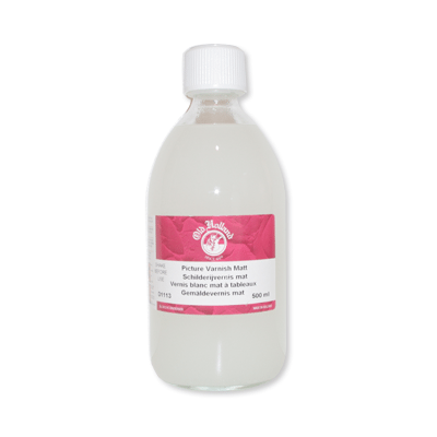 Le Vernis à tableaux mat OLD HOLLAND est un vernis souple qui ne jaunit pas, pour protéger la peinture. Ce produit auxiliaire est composé de résine acétone résolue en térébenthine avec ajout de cire d’abeilles pour obtenir le caractère mat.