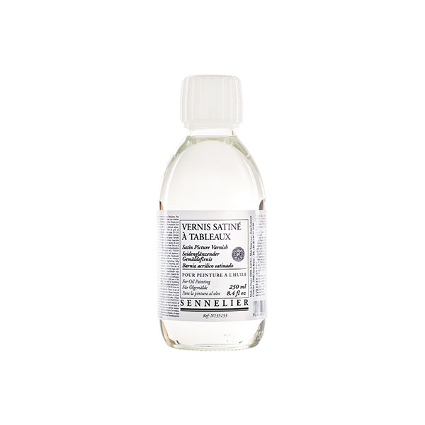 Le Vernis satiné à tableaux SENNELIER correspond à un vernis final à base de résine de synthèse, intermédiaire entre le vernis brillant et le vernis mat. Quelques heures de séchage suffisent pour obtenir un aspect définitif, il donne un film incolore et satiné, non jaunissant et très résistant. Le rendu transparent et sans reflet est parfaitement régulier. Il reste néanmoins difficilement réversible. Ce vernis s’applique sur une œuvre parfaitement sèche.