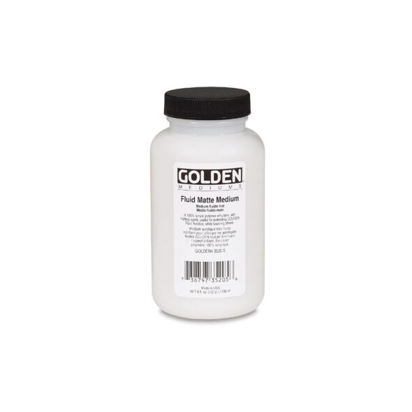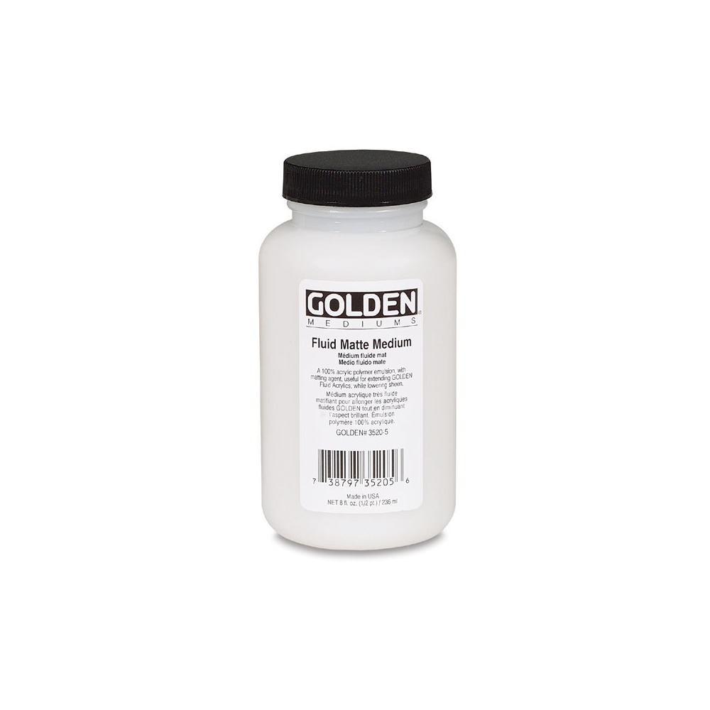 Le Médium fluide mat GOLDEN ou Fluid Matte Medium est utile pour fluidifier les couleurs. Il diminue également la brillance et améliore l’intégrité du film. L’artiste l’utilise notamment avec les acryliques Fluid Golden afin d’en réduire la brillance sans changer la texture.
