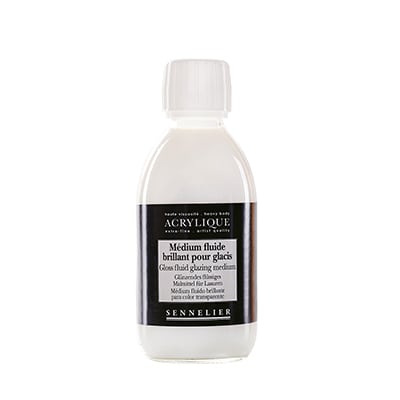 Le Médium fluide brillant pour glacis de SENNELIER augmente la fluidité, la luminosité mais aussi la profondeur de la peinture. Lorsque vous l’additionnez aux couleurs acryliques, vous obtiendrez des glacis brillants. Ce médium se dilue à l’eau et sèche rapidement pour un rendu transparent et résistant à l’eau.