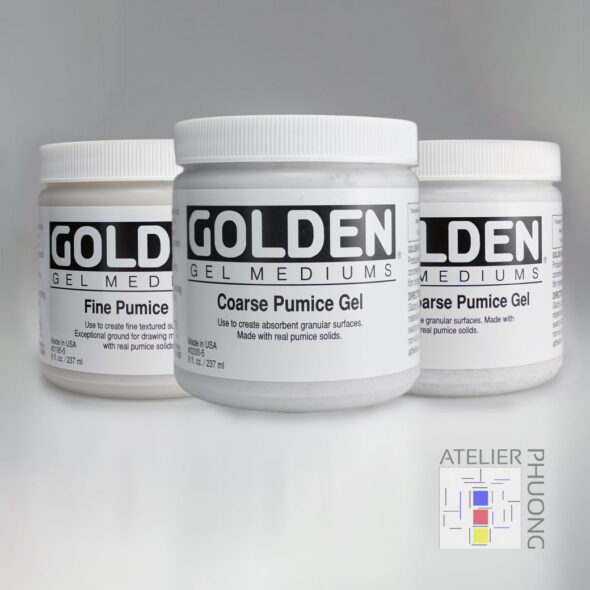 Les Gels Mortier de GOLDEN, ou encore Pumice Gel, sont à base de pierre ponce naturelle qui permettent d’obtenir des effets de matière granuleux. La densité de la pierre ponce naturelle est plus légère que celle du sable, ainsi son utilisation allège la toile et évite sa déformation. De couleur grise, ils peuvent être facilement colorés avec les couleurs Fluids de la même marque. Le Mortier Fin offre un excellent fond pour pastel.