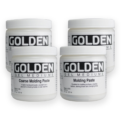 Le Molding Paste texturée, appelé Coarse Molding Paste est plus dure que la Light Molding Paste. Il est notamment plus translucide et chaud en couleur. Sa propriété cristalline en surface renvoie la lumière ce qui renforce les effets de couleurs en surface. Il est parfait pour réaliser des lavis.