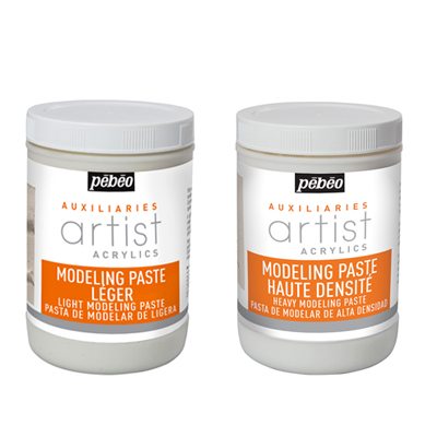 Le Modeling Paste Haute Densité de PEBEO est une pâte épaisse et texturée prête à l’emploi pour créer des reliefs et réaliser des empâtements, notamment pour la réalisation de fonds. Il s’applique au couteau, et peut être mélangé à la couleur humide qu’il va légèrement dégrader. Il garde l’empreinte de l’outil, se sculpte, se peint et se ponce une fois sec. Après séchage, il conserve parfaitement son volume et ne craquelle pas.