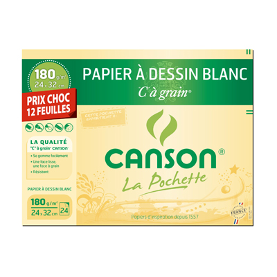 Le Pochette Papier à dessin blanc “C à Grain” 180g de CANSON est parfait pour pour l’apprentissage du dessin à l’école. On l’utilise principalement pour le dessin réalisé au crayon de papier, crayon de couleur ou feutre. Il est également idéal pour le travail à l’encre ou à la gouache. D’un blanc naturel, il dispose d’un côté à grain et d’un côté lisse. Il résiste aux gommages et aux grattages répétés sans pelucher.