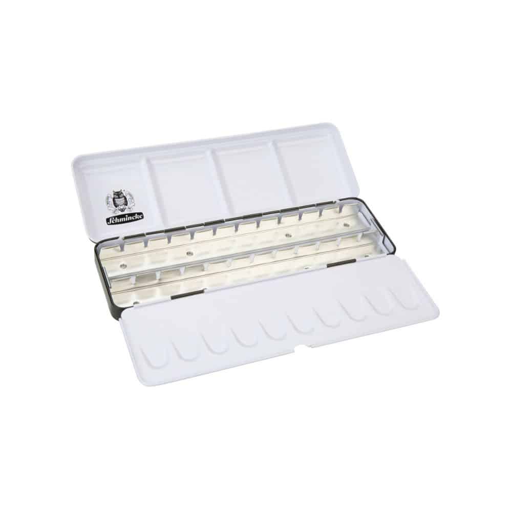 Cette boîte métallique noire est conçue pour ranger soit 24 demi-godets d’aquarelle, soit 14 godets. Elle offre une solution idéale pour créer votre propre palette sur mesure.