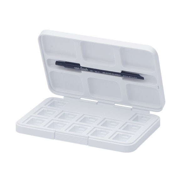 Cette Boîte aquarelle de voyage en plastique VAN GOGH est livrée vide mais avec de la place pour 12 godets de peinture à l’eau (vendus séparément).